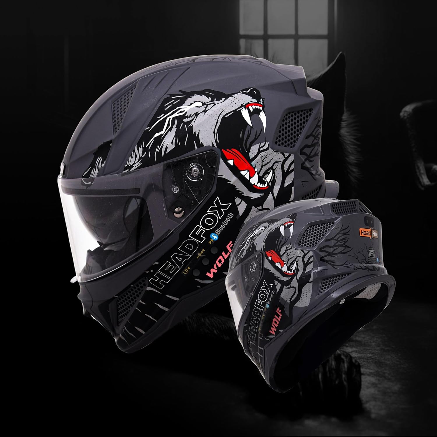 Helmetkart Wolf Full Face Bluetooth Helmet for Bike Waterproof Smart Helmet for Man & Women | ISI Certified | Built-in Bluetooth | Matte Grey Large (60 CM)